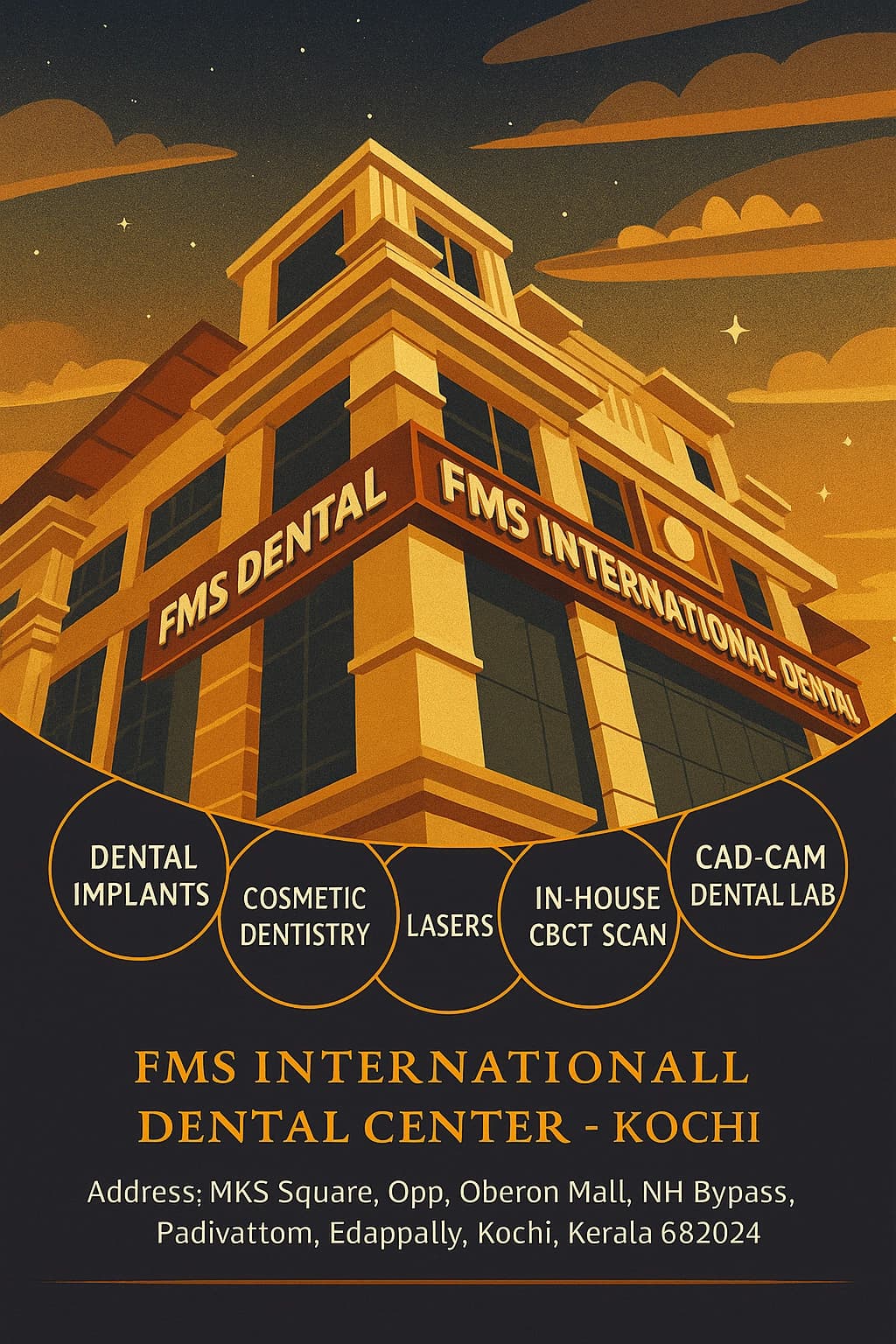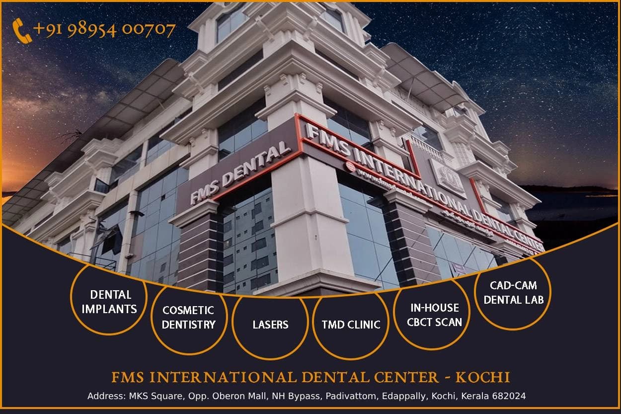✦ Oral & Maxillofacial Surgeon & Dental Implant Specialist at FMS International Dental Center ✦ MKS Square, Opp. Oberon Mall, NH Bypass, Padivattom, Edappally, Kochi, Kerala 682024 ✦ Hours: Mon-Sat: 9 AM–9 PM | Sun: 9 AM–7 PM ✦ Phone +91 98954 00707.