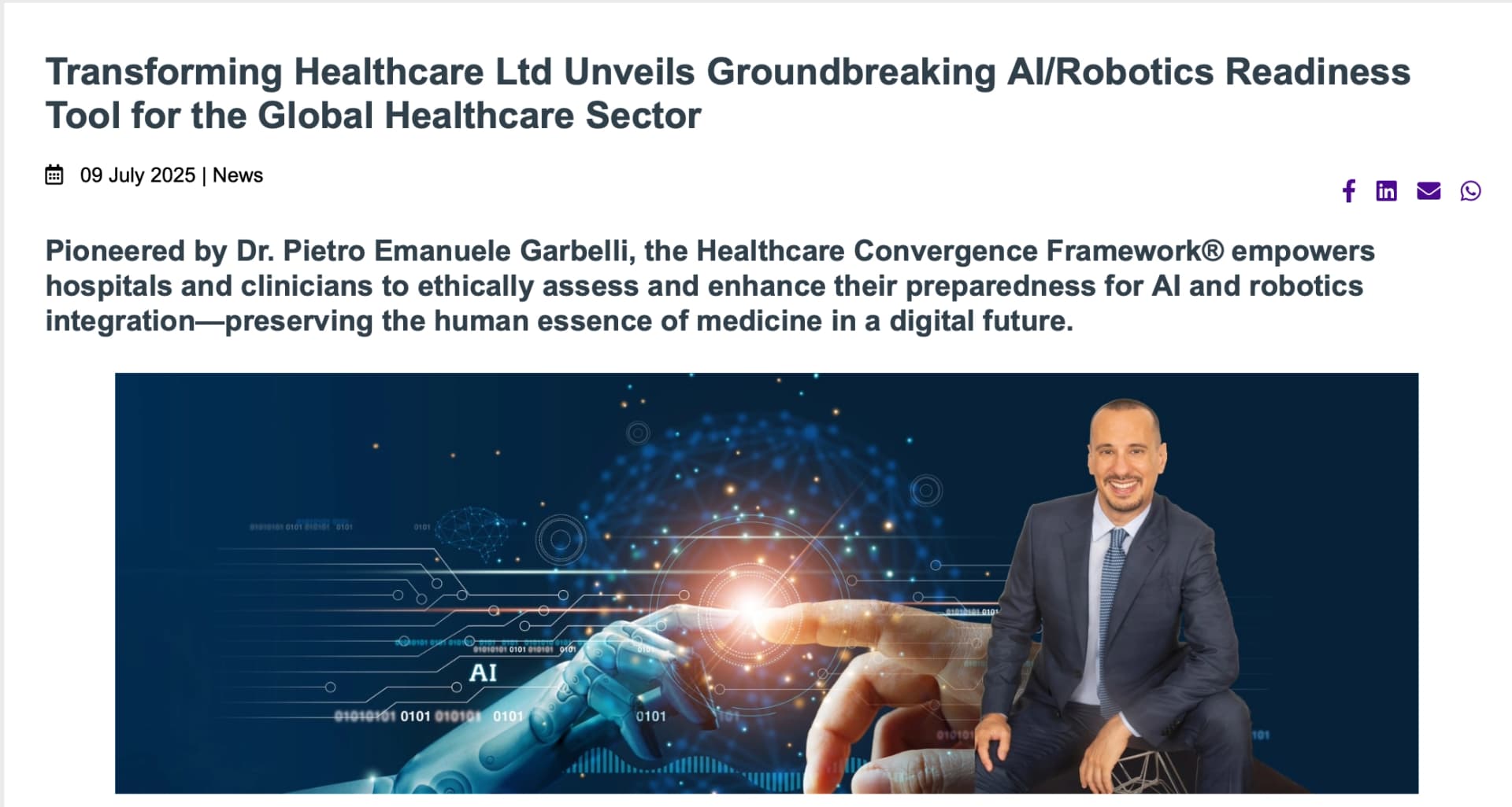 Dr. Pietro Emanuele Garbelli (“Dr Garbelli”) is a UK-based physician, healthcare strategist and MedTech advisor focused on assisting healthcare leaders and organisations adopt, navigate, and implement AI/robotics and healthcare automation safely, ethically and at scale. Working at the intersection of clinical practice, technology and executive decision-making, he supports boards, executive teams and MedTech leaders to turn innovation into measurable improvements in patient outcomes, workforce sustainability and operational performance. Dr Garbelli is the creator of the Healthcare Convergence Framework™ (HCF), a practical approach that helps organisations assess AI/Robotics readiness, align leadership priorities and design future-ready care pathways without disrupting frontline delivery....