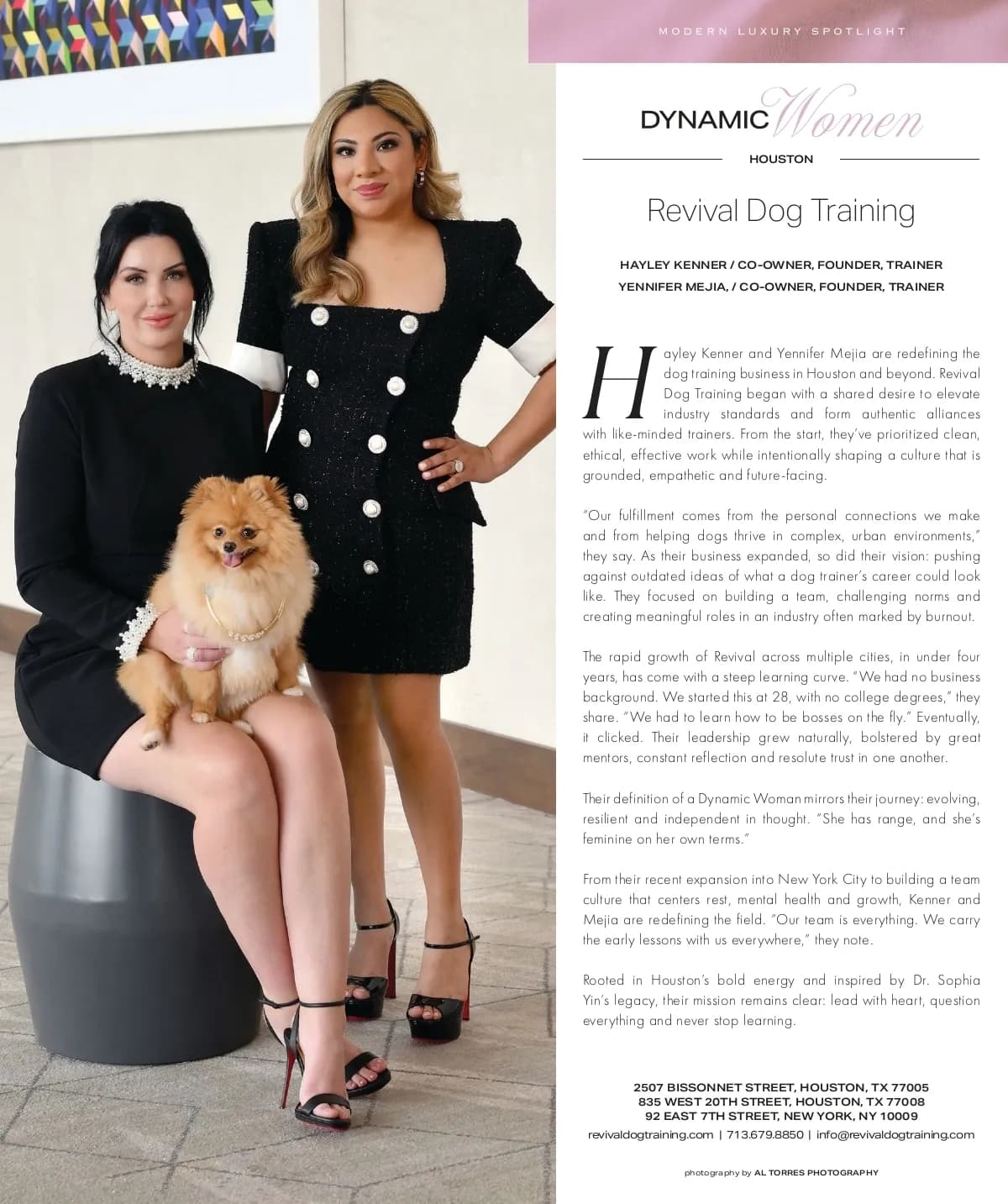 Revival Dog Training is a professional dog training company founded in Houston, TX in 2021. Since then, we have expanded with more locations in New York and the Greater Houston area. Revival Dog Training is dedicated to building balance, trust, and communication between dogs and their owners. Founded on the belief that effective training goes beyond obedience, Revival focuses on understanding behavior, addressing root causes, and creating practical solutions that work in real-world environments. Through customized training programs, Revival Dog Training helps clients navigate any challenge from leash reactivity and handling anxiety to every-day obedience and aggression. Each approach is tailored to the individual dog and household, ensuring meaningful, long-term results rather than qu...