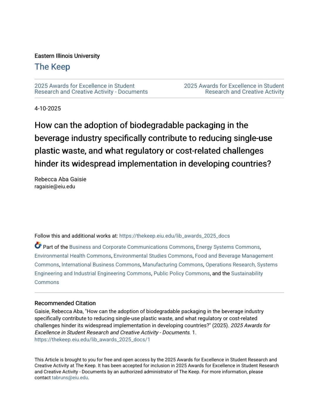 Rebecca Aba Gaisie is a recognized expert in sustainability and energy management, currently conducting high-impact research at Eastern Illinois University. She is the first-place recipient of the 2025 Award for Excellence in Student Research for her work on biodegradable packaging solutions for the beverage industry in developing markets. Her expertise spans Carbon Capture Deployment (CCS) in U.S. oil fields, the circular economy, and the strategic implementation of UN Sustainable Development Goals (SDGs). Rebecca’s work bridges the gap between technical energy transition strategies and practical business sustainability.
